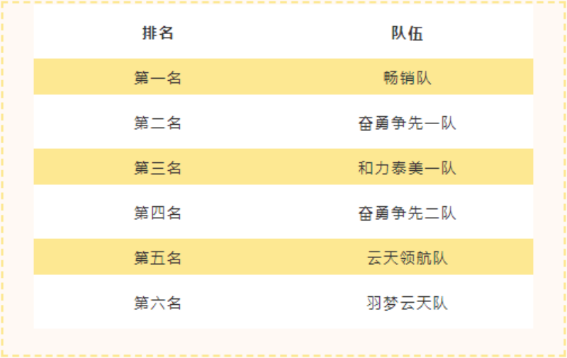 為了鼓勵(lì)職工參與的積極性,本次比賽設(shè)置獎(jiǎng)勵(lì)前六名。經(jīng)過一天激烈的比拼,最終獲得前6名的隊(duì)伍分別是: